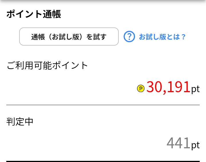 | 30,076ポイント (30,076円) | → | 30,119ポイント (+43pt) (30,119円(+43円)) |