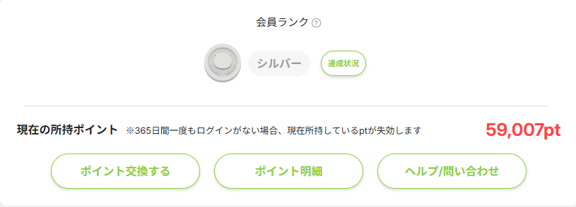 | 56,858ポイント (5,585.8円) | → | 59,007ポイント (+2,149pt) (5,900.7円(+214.9円) |