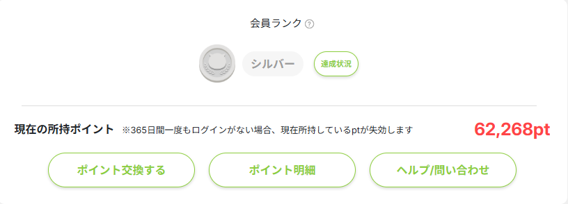 | 59,007ポイント (5,900.7円) | → | 62,265ポイント (+3,325pt) (6,225.5円(+332.5円) |