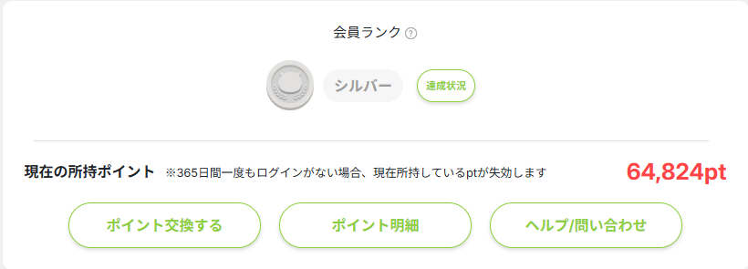 | 62,268ポイント (6,226.8円) | → | 64,824ポイント (+2,556pt) (6,482.4円(+255.6円) |